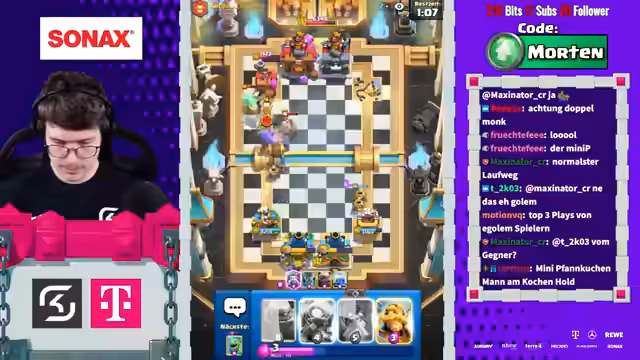 05:15:04In der entscheidenden Phase des Pushes liegen die Fokus auf Kartensynergien und gezielten Zügen. Das Team setzt stark auf Golem-Kombinationen, Tornado und Minipacker, um dem Gegner Schaden zuzufügen. Es kommt zu intensiven Cycles, wobei der Einsatz von Evo-Walker und Bowler entscheidend ist. Die Spiele werden als nervig, aber auch als massiv und erfolgreich beschrieben, wobei plus 22 als wichtiger Sieg verbucht wird.