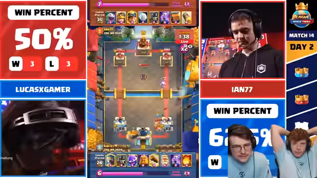 01:27:59Das dritte Spiel zwischen Lukas und Ian wird vorgestellt, beides hochrangige Spieler im Lower Bracket. Es geht um die eingesetzten Decks wie Hawk, Mortar und Royal Giant, sowie die spannungsgeladenen Spielzüge und Entscheidungsmomente, die das Spielverlauf prägen.