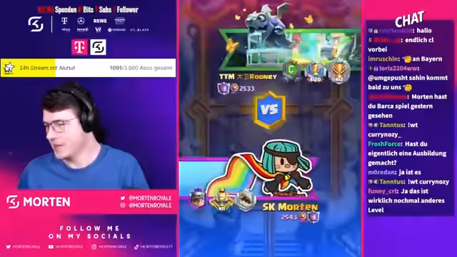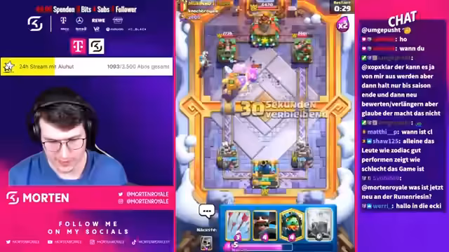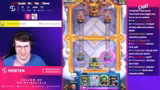 00:53:40Während des Streams teilt der Streamer seine Erlebnisse aus den Spielen mit, wobei er immer wieder auf die Notwendigkeit von All-in-Spielen eingeht. Er erwähnt, dass er gegen bestimmte Karten wie Recruits oft keine Gegenkarten hat und deswegen alles auf einen einzigen Push setzen muss. Auch die Taktik, mit Goblin Giant und Runenriesen zu pushen, wird immer wieder thematisiert, wobei der Streamer betont, dass diese Kombination extrem stark ist und oft zu einem sofortigen Turmverlust beim Gegner führt.