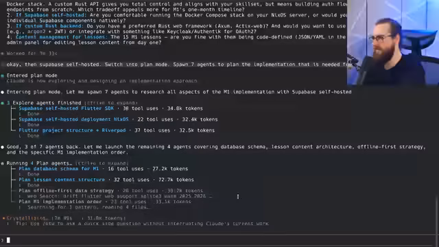 00:29:10Der Streamer demonstriert die Funktionsweise seines Autodeveloper-Systems, das durchgehend im Projekt läuft. Ein KI-Agent-System übernimmt die Forschung, Implementation, Code-Review und Finalisierung von Issues, was bereits zu über 200 Commits geführt hat. Dabei zeigt er auch die Herausforderung, dass bei zu komplexen Issues die KI überfordert sein kann. Als Grundlage für diese intensive Nutzung erwähnt er sein neues, teures Minimax-Abo, das ihm eine hohe Prompt-Rate ermöglicht und sich für dieses Szenario als lohnend erweist.