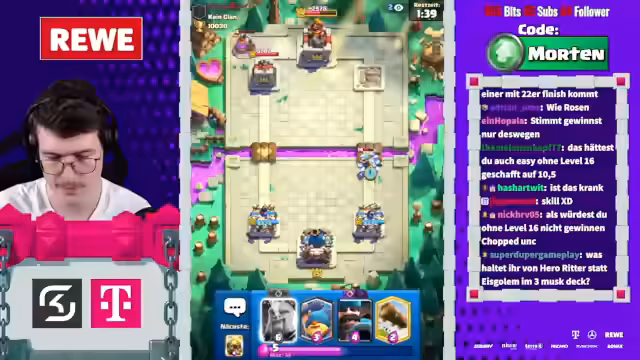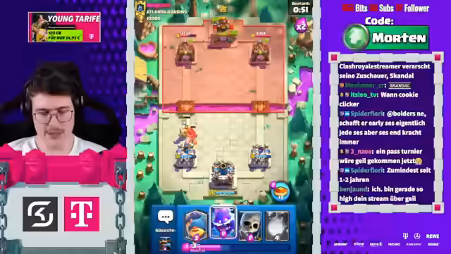 00:06:01Der Stream startet mit Fokus auf das 2vs2-Spiel gegen einen Gegner mit einem Evo-Baby D Deck. Es gibt anfängliche strategische Überlegungen, wie man mit Ranken und Golem agieren soll, um den Gegner unter Druck zu setzen. Der Streamer analysiert die gegnerischen Plays, insbesondere die Wirkung von gehackten Karten, und betont die Notwendigkeit, clever zu pushen und nicht übermäßig zu investieren, um den eigenen Turm nicht zu gefährden.