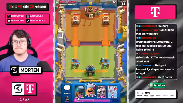 04:19:24Der Streamer zeigt sich erfreut über erfolgreiche Spiele und den damit verbundenen Push in höhere Ränge. Er erwähnt einen massiven Push von über 300 Trophäen während des Streams. Besonders freut er sich über Siege, bei denen er wichtige Karten wie Golem und Freeze effektiv einsetzen konnte. Er bittet seine Zuschauer, ihm weiter zu folgen und zu liken.