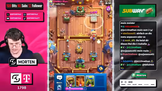00:08:39Der Streamer analysiert eingehend die aktuelle Meta und den Zustand verschiedener Karten in Clash Royale. Er äußert sich besonders kritisch zu 'Skelly Dies', die er als übermächtig ('gottlos OP') bezeichnet. Er diskutiert die Balance verschiedener Decks wie 'Evo Drill', 'Hunter' und 'Scalities' und äußert Frustration über als 'choppt' oder 'schimmel' empfundene Kartenkombinationen. Die Diskussion zeigt sein tiefes Verständnis für das Spiel und seine reflektierte Sicht auf aktuelle Entwicklungen.