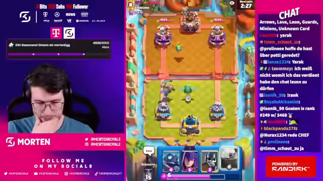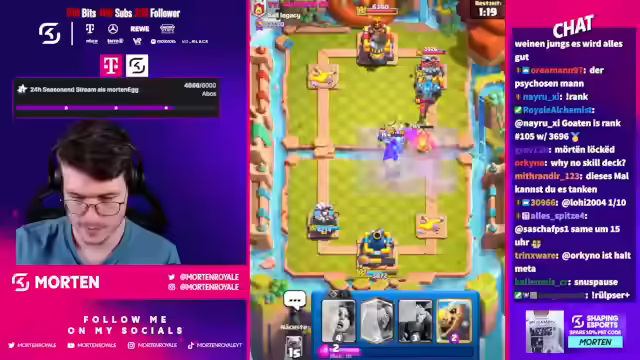 00:03:34Der Stream startet mit einem schwierigen 100-0 Matchup, das als kaum gewinnbar eingeschätzt wird. Trotzdem gibt es positive Stimmung und Dankbarkeit für die ersten Prime-Subs. Es wird über unfaire 1v1-Situationen und die Notwendigkeit von 4.500 Subs gesprochen. Ein Level 8 Hype Train wird erwähnt, was die Sub-Generierung durch Twitch Prime hervorhebt. Es wird überlegt, ob das Morten-Eckwunder ein gutes Angebot ist. Im weiteren Verlauf werden zufällige Decks der Gegner thematisiert und der Support durch Subs und Spenden betont. Der Streamer bedankt sich für die Geschenke und die Unterstützung, insbesondere für die Level 8 Hype Train. Es wird überlegt, ob das Morten-Eckwunder ein gutes Angebot ist. Im weiteren Verlauf werden zufällige Decks der Gegner thematisiert und der Support durch Subs und Spenden betont. Der Streamer bedankt sich für die Geschenke und die Unterstützung, insbesondere für langjährige Subs und Hype Trains.