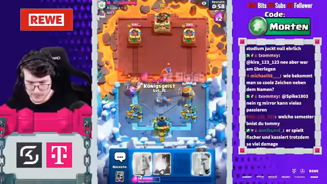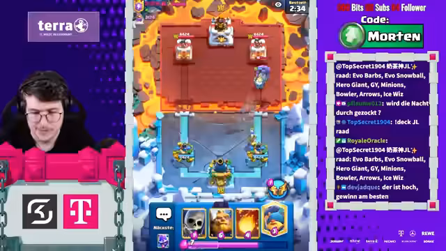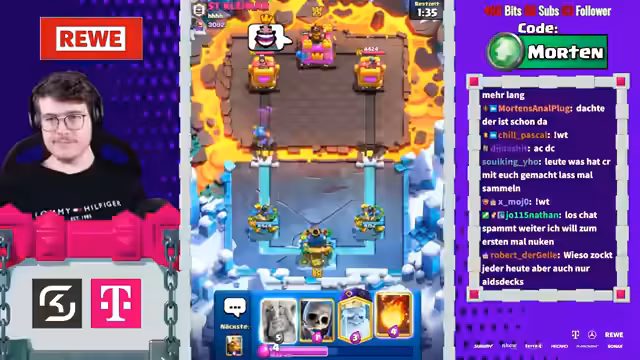 00:04:05Ein neuer Moderator namens Jonathan wird begrüßt. Die Tatsache, dass Karl anscheinend keine Lust mehr auf Crash Royale hat, wird thematisiert. Der Streamer kündigt das bevorstehende Evo-Update an und äußert seine Frustration über die Magier-Karte, die er als zu stark empfindet, besonders im Zusammenspiel mit dem Nado. Er wünscht sich Buffs für bestimmte Karten wie die Megamanie.