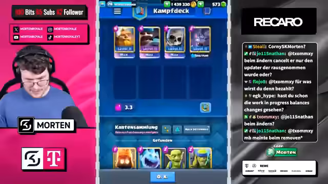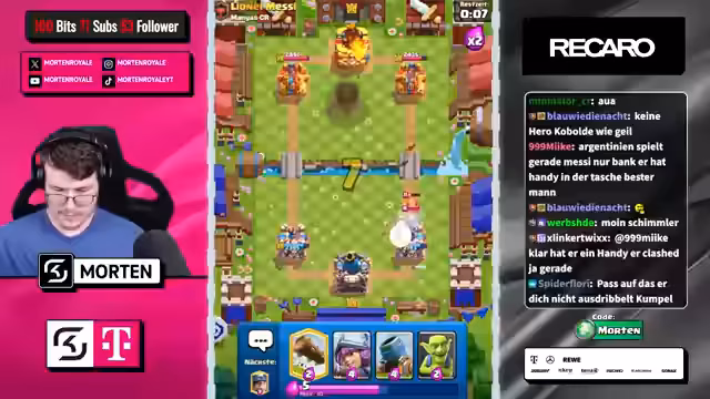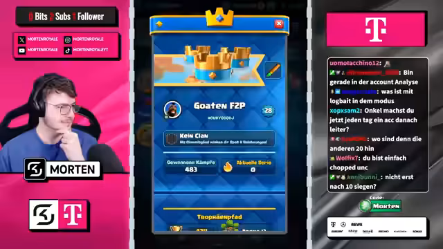 02:53:45Nach erheblichem Schaden links im Spiel gelingt es, den Gegner zu besiegen (GG's). Ein bemerkenswerter Erfolg wird errungen, als der Streamer auf den Platz 1 der Weltrangliste vorrückt. Die Freude ist groß und die Zuschauer werden explizit zur Interaktion aufgefordert, wie ein Daumen nach oben für das YouTube-Video und das Eintragen des Codes 'Morten' in Supercell-Spielen. Dies stellt einen Höhepunkt im Stream dar.