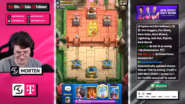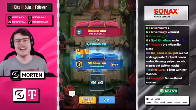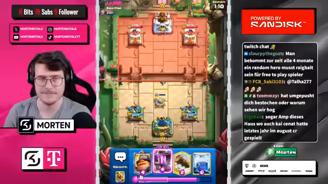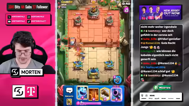00:00:19Der Stream beginnt mit Begrüßungen und lockeren Einordnungen in den Game-Day. Der Streamer wünscht Erfolg und kommentiert verschiedene Chat-Nachrichten. Es werden persönliche Bemerkungen ausgetauscht, die jedoch weitgehend ignoriert werden, da der Fokus auf der bevorstehenden Gameplay-Erfahrung liegt. Einleitend wird der normale Clash Royale-Dienstag erwähnt und eine gewisse Müdigkeit bei Spielen wie Touchdown festgestellt. Man lehnt sich auf den Mega-Ritter, um Abwechslung zu finden, und berichtet über positive Erfahrungen mit MK-Decks in früheren Seasons.