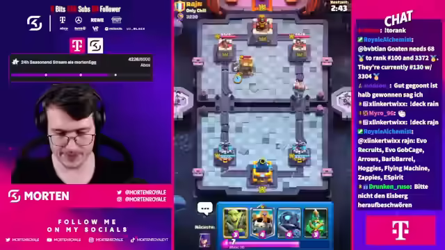 02:42:18Im späteren Verlauf des Streams äußert sich Frustration über bestimmte Spielsituationen und Karten. Die Effektivität der Minions wird als besonders störend empfunden, was zu Ausrufen wie 'Minions ist Fickmaschine' führt. Es wird der Ärger darüber deutlich, dass man trotz guter Ausgangslage durch bestimmte Kartenkombinationen ins Hintertreffen gerät. Der Streamer kommentiert auch das Spielverhalten der Gegner, wobei er feststellt, dass einige Spieler ('Digga, wie Brogan ist Golem') scheinbar unkonventionelle oder überraschende Strategien verfolgen. Trotz der Herausforderungen und Rückschläge werden mehrere Spiele absolviert, wobei der Ausgang jedoch wechselhaft ist. Die Kommentare spiegeln die emotionale Achterbahn wider, die mit kompetitivem Gameplay einhergeht, von Frustration über knappe Niederlagen bis hin zu Momenten der Hoffnung auf einen Sieg. Die Notwendigkeit, sich ständig anzupassen und neue Taktiken zu entwickeln, bleibt ein zentrales Thema.