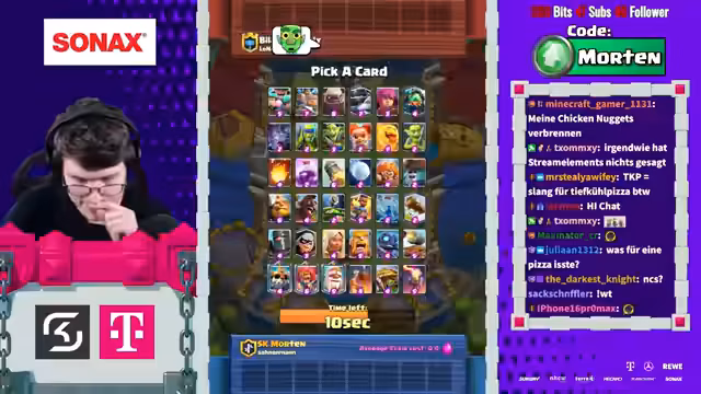 06:01:18Der Stream interagiert stark mit dem Chat, indem dieser bei den Draft-Entscheidungen mitbestimmt. Die Community soll zwischen Drill und Bush wählen. Nach einem anfänglichen, aber erfolglosen Versuch mit einer Kartenauswahl, gegen die der Gegner ein starkes Skelly-Burble-Deck spielt, gibt es einen zweiten Versuch. Der Chat wählt erneut eine Kombination, die sich später als problematisch erweist, und der Spieler äußert Frustration über die Wahl.