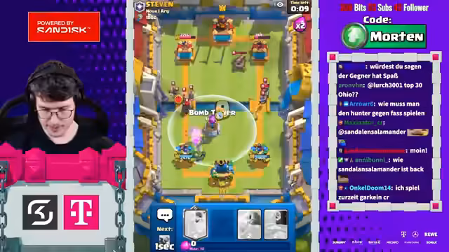 01:02:37Nach einer kurzen Phase mit diversen Kommentaren und Interaktionen mit dem Chat, fokussiert sich der Streamer wieder auf das Spiel. Er erwähnt, dass er später Poison gegen Fireball wählt, insbesondere weil der Gegner vermeintlich nicht so gut spielt. Ein Ziel wird gesetzt: Man muss sich konzentrieren, da die Gegner in den Top 100 deutlich abgezockter sind und die Runden länger dauern.