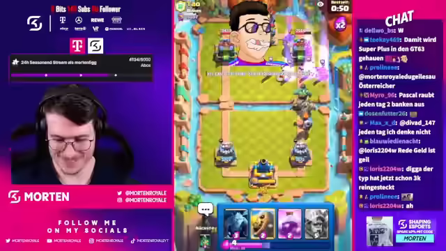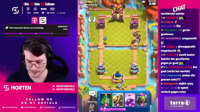 02:10:14Der Einsatz des Goblin Giant in Kombination mit Angriffen aus der zweiten Reihe wird hervorgehoben. Trotzdem äußert der Streamer die Angst, das Spiel zu verlieren. Der gezielte Einsatz der Rocket-Karte wird erwähnt, was auf strategische Entscheidungen und den Versuch hindeutet, das Spielgeschehen zu beeinflussen. Es folgt eine kurze Erwähnung von Dankesbekundungen für Prime-Abonnements. Der Fokus liegt auf dem aktuellen Spiel, der Analyse der gegnerischen Strategie und dem Versuch, durch taktische Züge und den Einsatz von Spezialkarten die Kontrolle zu behalten oder zurückzugewinnen. Die Anspannung und der Wettbewerbsgeist sind spürbar, da jeder Zug entscheidend sein kann.