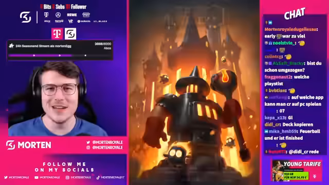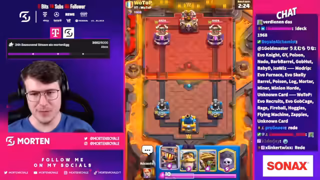 03:37:19Der Stream startet mit taktischen Manövern rund um den Evo-Ofen. Es wird versucht, den gegnerischen X-Bogen anzugreifen, der aber offensiv verteidigt werden kann. Der Fokus liegt darauf, den King Tower nicht zu aktivieren und den Schaden mit Poison-Spells zu maximieren. Evo-Archer werden als sehr stark angesehen, und das Spielziel ist es, den Turm des Gegners auf 2,7 zu bringen. Der Spielstil ist aggressiv und zielt darauf ab, durch ständigen Druck einen Vorteil zu erzielen.