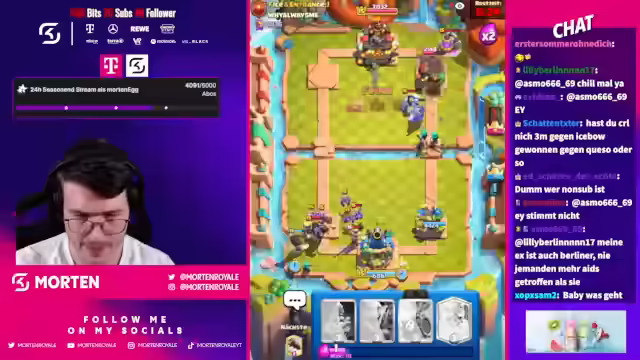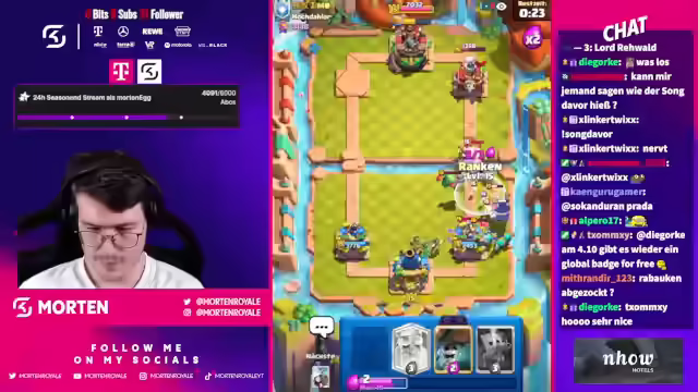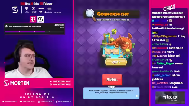 04:00:38Es wird überlegt, am Sonntag einen 12-Stunden-Stream zu veranstalten, um einen XL-Letterpush zu machen, aber die Idee wird aufgrund von Zeitmangel verworfen. Es wird ironisch kommentiert, dass man dann wieder nur 10 Zuschauer haben werde. Es wird die Frage aufgeworfen, ob im El Salvador-Clan Drogengeld fließt. Es wird ein Spielzug kommentiert, bei dem Golem Healer gespielt wird, um das Spiel zu gewinnen und den Golem hochzuleveln. Es wird sich über den Prime-Support bedankt. Es wird das Ziel formuliert, schnell zu gewinnen, um sich wieder auf Clash Royale konzentrieren zu können. Es wird die Relevanz des Passes auf verschiedenen Accounts angesprochen. Es wird ein Deck mit Hexe, Hida und Berserkrin als Deck bezeichnet, das sich für Gleichberechtigung einsetzt.