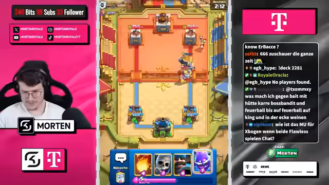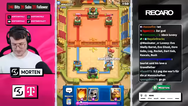 00:11:46Während des Streams werden mehrere Spiele gespielt und analysiert. Der Streamer diskutiert Match-ups, macht Predictions und kritisiert seine eigenen Fehler, wie eine schlechte Defense. Zwischen den Spielen gibt es Ausflüge in die aktuelle Meta, insbesondere auf TikTok, und die Erörterung von Decks, die im Shop verfügbar sind. Der Fokus liegt auf aggressivem Play und der Nutzung von Elixir-Advantage.