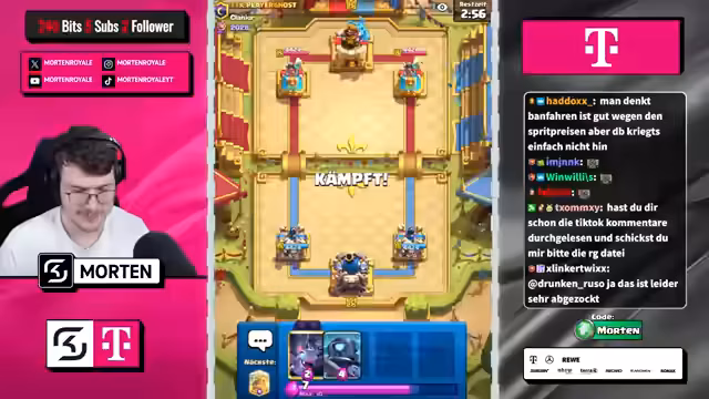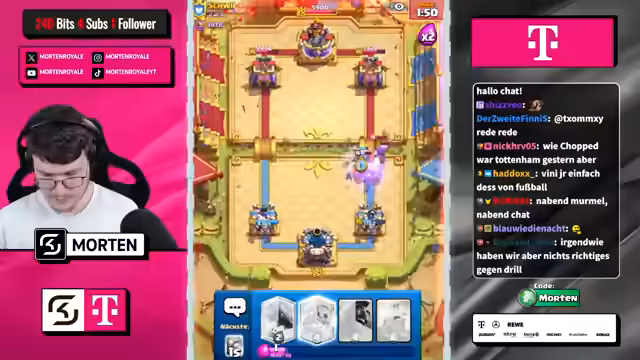 01:27:22Der Streamer konfrontiert das Publikum mit der Frage, was in Deutschland wichtiger ist, 'Guning' oder 'Döner'. Später geht es darum, die 'Chaos-Ladder' und anstehende globale Turniere anzukündigen. Er lädt die Zuschauer ein, den Code 'Morten' in Supercell-Spielen einzulösen und fordert sie auf, für seinen Kanal zu liken, zu folgen und ein Abo zu hinterlassen.