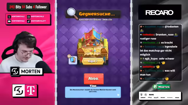 05:38:27Das Spiel beginnt mit einem veränderten Pattern bei Gally, das den Streamer überrascht. Früher hatte man einen klaren Vorteil, doch Hunter agiert sehr nervös und Fischer wird falsch gespielt, was keinen Nutzen bringt. Gally stört weiterhin das Spielgefühl, was zu einer langen Suchzeit auf der Trophy Road führt. Ein Champion wie Barbells zeigt sich dabei als problematisch, da er keinen Mehrwert liefert und das Matchup erschwert.