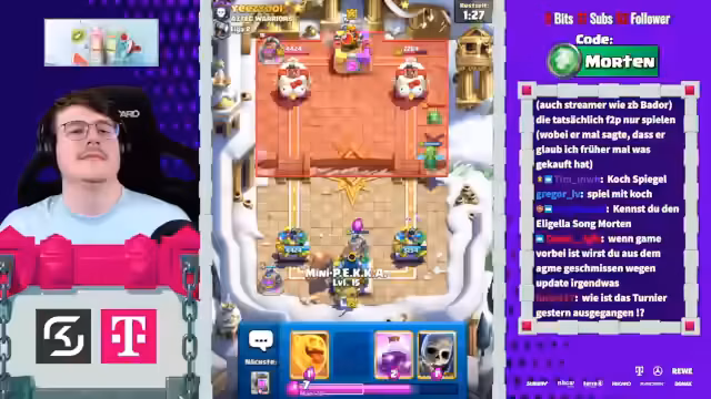 02:14:00Es wird über das Fehlen von Bugfixes und die Möglichkeit diskutiert, dass der Mini-Pekka unerwartet King-Tower-Runden beenden könnte, ähnlich einem früheren 'Prime-Helden-Pekka'-Bug. Der Streamer erwähnt ein Pass-Giveaway für die Community als Dank für die Unterstützung. Die Balance von Helden und die Möglichkeit, andere Helden nicht kaufen zu können, wird kritisiert. Es wird die Frage aufgeworfen, warum das Spiel 'finished' sei und warum bestimmte Helden nicht die erwartete Leistung erbringen. Die Heilungsmechanik des Mini-Pekka wird als 'broken' bezeichnet, insbesondere im Kampf gegen andere Truppen wie den Giant, wo er schnell Level 20 erreichen kann.