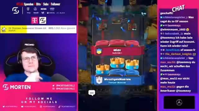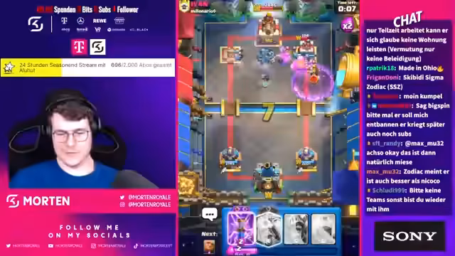 03:35:26Mortenroyale kommentiert die Spielweise seiner Gegner und versucht, deren Strategien zu durchschauen. Er äußert sich über Giant-Lampen und Möhrmatchabs und hadert mit seiner eigenen Hand. Er diskutiert mit Zuschauern über sein Alter und seinen Werdegang. Er analysiert das Gameplay und hadert mit eigenen Fehlern. Es folgen Diskussionen über Lightning Value und Lags im Spiel. Morten und seine Mitspieler necken sich gegenseitig und kommentieren die Spielweise des anderen. Er äußert sich abfällig über bestimmte Decks und Spieler und beschuldigt Gegner des Opferns. Er analysiert die gegnerischen Decks und versucht, King Tower zu aktivieren. Er diskutiert über Match-Ups und die Schwierigkeit, gegen bestimmte Decks zu spielen. Er kommentiert die Teamzusammensetzung und die Leistung seiner Mitspieler. Morten diskutiert über Banns im Chat und erklärt, warum er bestimmte Personen gebannt hat. Er tauscht sich mit dem Chat über verschiedene Themen aus, darunter Pokémon und andere Spiele.