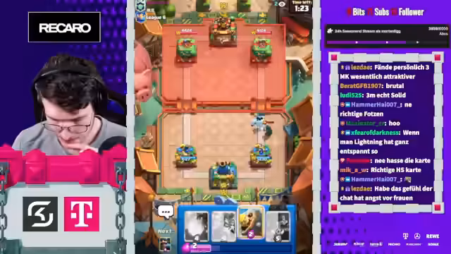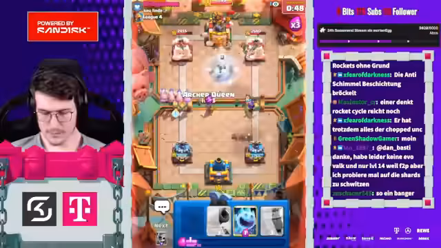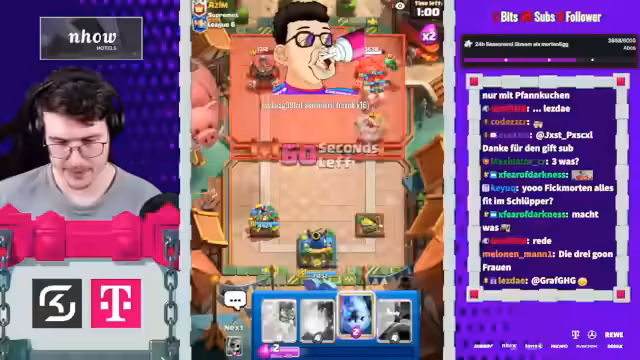 00:13:51Morten kommentiert seine strategischen Entscheidungen im Spiel, insbesondere die Platzierung der „Huggies“ und den Einsatz von „3M“ (Drei Musketierinnen). Er betont die Wichtigkeit, frühzeitig „3M“ zu spielen, um den Gegner unter Druck zu setzen. Während des Spiels interagiert er intensiv mit dem Chat, bedankt sich für Unterstützung und kommentiert die Reaktionen der Zuschauer auf seine Spielweise. Er erwähnt, dass es der zweite Tag der Saison ist und die Spielersuche mittlerweile besser funktioniert. Morten analysiert weiterhin die gegnerischen Decks und versucht, die besten Konter zu finden. Er lobt die Effektivität seiner „Barbarrel“-Verteidigung und die „Devjet“-Taktik, die ihm guten Schaden ermöglicht. Die Diskussion über die neuen „Masketeers“ und deren Kombination mit dem „Barbell“ zeigt seine Begeisterung für neue Strategien.