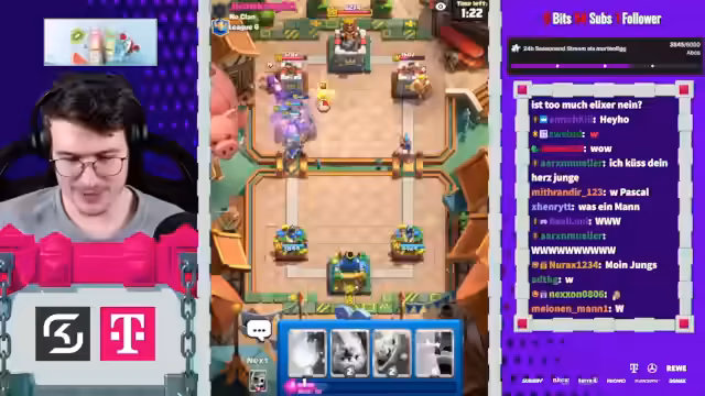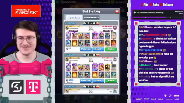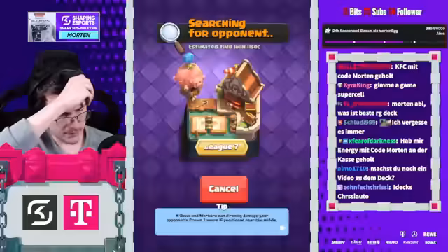 00:03:18Der Stream beginnt mit einer intensiven Clash Royale Partie, in der der Spieler, Morten, schnell einen Turm verliert. Er äußert Frustration über den schlechten Start und das gegnerische Deck, welches er als „Psychosendeck“ bezeichnet. Trotz des Rückstands versucht er, das Spiel zu drehen und analysiert die gegnerischen Karten wie „Giant Infernturm“ und „Graveyard Freeze“. Er kommentiert die Effektivität seiner eigenen Musketiere und des „Barrels“ und versucht, einen Elixier-Vorsprung zu erzielen. Die Spannung steigt, als er mit „Evo-Hoggies“ angreift und das Spiel letztlich gewinnt, was er als „sehr, sehr geiles Game“ bezeichnet. Die Diskussion über Decks und Strategien zieht sich durch diesen Abschnitt, wobei Morten immer wieder die Spielweise des Gegners kritisiert und seine eigenen Züge verteidigt.