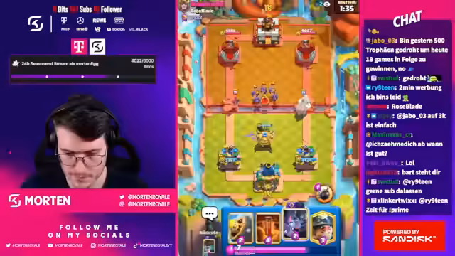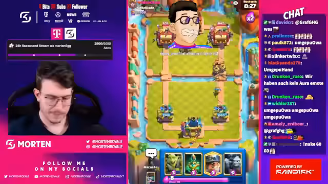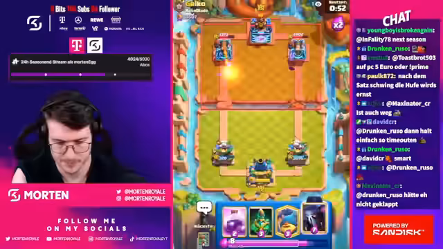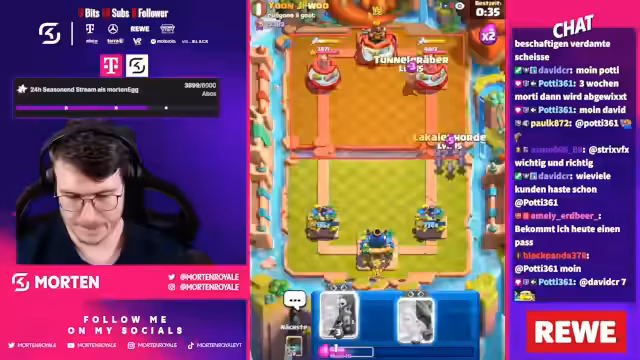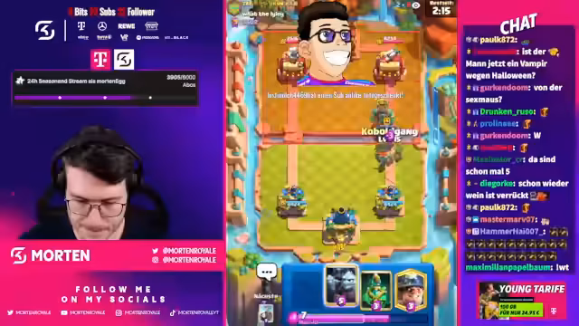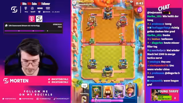 00:40:17Ein tiefes Gefühl der Frustration breitet sich aus. Ein technisches Problem mit den leeren Kopfhörern versinnbildlicht den "Clash Royale-Ghetto"-Zustand, in dem man sich befindet. Die Unzufriedenheit mit den eigenen Leistungen, wie dem Überleben des "Pekka", und der ständige Ärger über Gegner, die einen "gesniped" haben, lassen den Streamer das Spiel als "Huren-Söhne-lastig" und "No-Skill" bezeichnen und beschwört den Chat, "Ich kann das Game nicht mehr tanken".