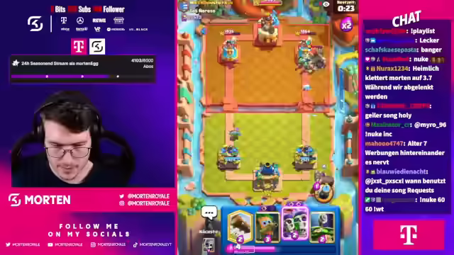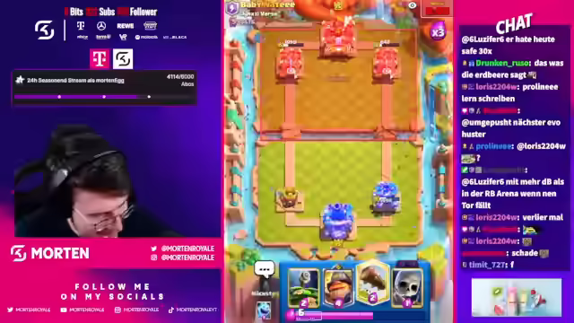 00:40:17Der Streamer vergisst, seine Kopfhörer aufzuladen, was zu einer Unterbrechung führt. Er scherzt darüber, jemanden zu bezahlen, der ihn täglich daran erinnert, seine Kopfhörer zu laden. Es wird ein verlorenes Spiel thematisiert, bei dem der 'Pekka' überlebt hat. Der Streamer analysiert das Deck eines Gegners und äußert sich überrascht über die Wahl des 'E-Spurts'. Er vermutet, dass er gesniped wurde und sieht 'Gespenster'. Es wird erwähnt, dass er 200 Trophäen benötigt, um sein Ziel zu erreichen. Der Streamer fragt sich, ob ein bestimmter Spieler Lukas oder Faust ist und wundert sich darüber, dass Lukas 'Pekka' spielt. Trotz einiger Schwierigkeiten und Frustrationen, bleibt der Streamer motiviert, sein Ziel von 4000 Trophäen anzugreifen. Er kommentiert die Spielmechaniken und äußert sich kritisch über den 'Broken Evo Baby Dragon'.