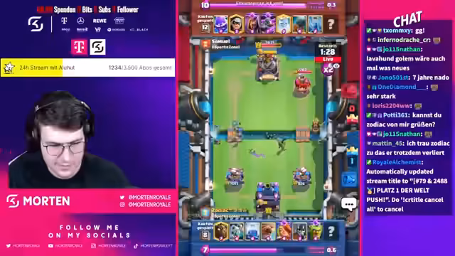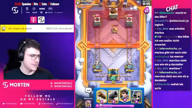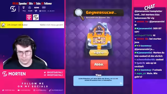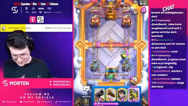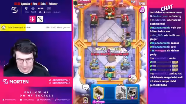 00:20:43Während des Streams werden mehrere Spiele gespielt und kommentiert. Der Streamer zeigt Reaktionen auf Chat-Kommentare und einige Interaktionen werden thematisiert. Ein wiederkehrendes Thema sind die Frustmomente im Spiel, insbesondere durch bestimmte Karten wie P.E.K.K.A. und den Tower. Der Umgang mit Gegnern und das Erlebnis im Turnier werden im Chat und vom Streamer angesprochen.