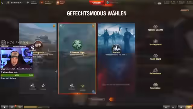 00:00:00Zu Streambeginn wurde der heutige Plan vorgestellt. Hauptfokus liegt auf dem Abschluss des Stillen Neuen Jäger mit dem Free2Play Account, dem Ausspielen von Marken und der Vorbereitung von Panzern für das anstehende Battle Pass Zusatzkapitel. Des Weiteren sollen verbleibende Missionen, insbesondere die 15er Mission zum Excalibur, mit deutschen Panzern abgeschlossen werden. Es wurde betont, dass dies ein actionreicher Tag mit viel Inhalt sei.