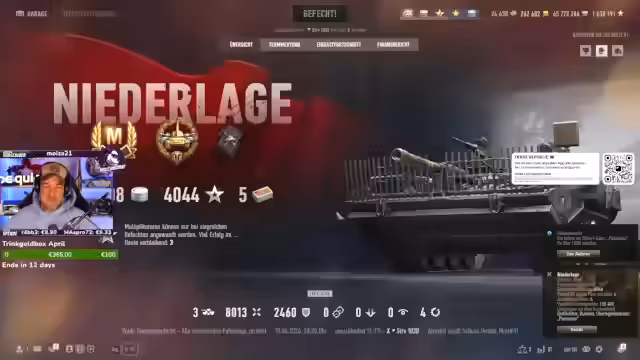 00:40:55Der Streamer demonstrierte beeindruckende Fähigkeiten im Spiel, indem er mehrere feindliche Panzer in Schlachten vernichtete und strategische Vorteile nutzte. Er interagierte intensiv mit seiner Community, bedankte sich für Spenden und Subs und reagierte auf Chat-Nachrichten. Der Streamer diskutierte über verschiedene Panzermodelle und deren Tauglichkeit für verschiedene Spielstilen. Er zeigte auch Frustration über teils unerklärliche Niederlagen trotz guter Leistung.