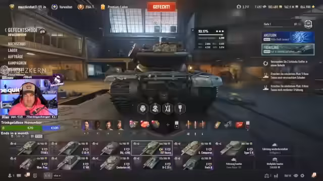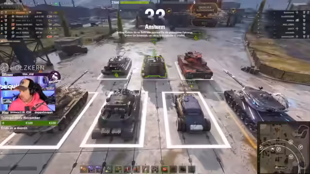 00:00:00Zu Beginn des Streams beschäftigt sich der Streamer mit dem Ziel, das Event „Ansturm“ mit seinem Mitspieler Stan abzuschließen. Beide haben bereits 1000 Prestigepunkte, müssen aber weiter kämpfen, um nicht aus der Gold-Liga zu fallen. Es wird über die Wahl der Panzer diskutiert, darunter ein Centurion oder ein Batchett, da ein strategisches Vorgehen und gute Teamzusammenarbeit entscheidend sind.