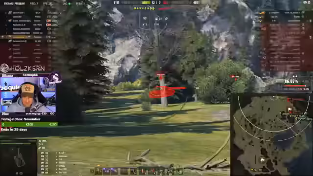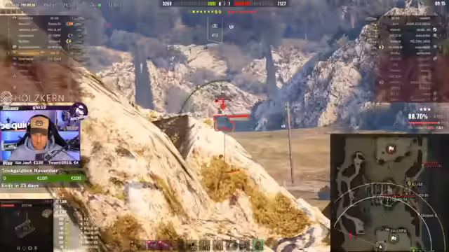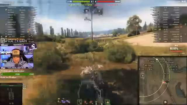 03:18:14Eine geplante Aktion missglückt, weil der Streamer eine Sekunde zu spät zielte und sein Gegner verschwand. Der Mitspieler wird gebeten, einen Fosch-Panzer nachzuziehen. Der Streamer nutzt die Zeit, um Unterstützer und Gönner im Chat zu erwähnen und bedankt sich für großzügige Spenden und Abonnements.