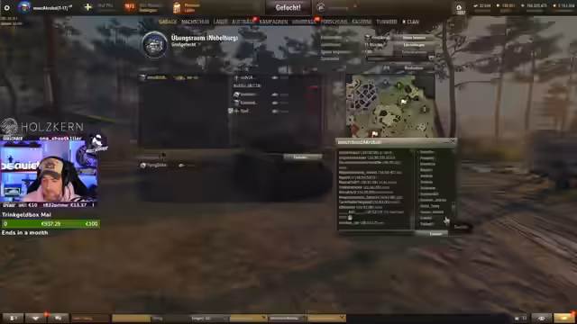 11:06:02Eine große finale Verlosung für eine Tigermaus (Tier 9 Premium-Panzer) wird angekündigt. Die Teilnahme erfolgt durch einen Team-Übungsraum namens 'Maustiger'. Der Gewinner wird nicht durch Überleben, sondern durch den höchsten kombinierten Schaden (eigener Schaden + Unterstützungsschaden) ermittelt. Der Streamer sucht gezielt nach Freiwilligen mit einem Luchs-Panzer für das Team, während Besitzer der Tigermaus ausgeschlossen werden.