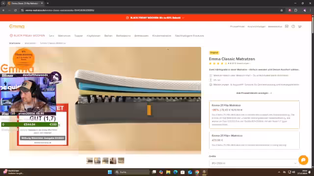 03:48:09Der Streamer räumt eine kleine Unstimmigkeit bei seinem Gewicht aus und korrigiert seine Angabe. Er betont, dass die Emma-Matratzen getestet werden können und eine 100-Nächte-Probeschlaf-Garantie sowie eine kostenlose Lieferung und Rücksendung bieten. Auf die Produkte gibt es bis zu 10 Jahre Garantie. Diese Koaktion läuft bis Ende November.