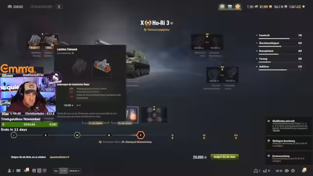 03:12:07Nach dem Gefecht widmet sich der Streamer der Analyse. Er ist unzufrieden mit seiner eigenen Leistung und spricht über RNG (Random Number Generation), das seine Trefferquote negativ beeinflusst habe. Zudem erwähnt er ein technisches Feature namens 'Good Feel', das ihm eine Überbestimmung ermöglicht, und diskutiert Upgrade-Systeme, wie die 'Feldmodifikationen', die für Panzer-Optimierungen existieren.