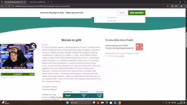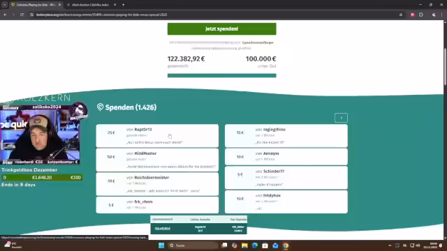 03:32:01Das Charity-Event ist noch ein bis zwei Tage offen, da auf ausstehende Zahlungen der Auktionsgewinner gewartet wird. Der aktuelle Spendenstand liegt bei 113.000 Euro, mit einem fehlenden Rest von etwa 7.000 Euro. Parallel wird das angekündigte 3.500€-Gaming-PC-Giveaway für den 23.12. bestätigt. Die vollständige Transparenz der Auktionen ist über die Spendenseite einsehbar.