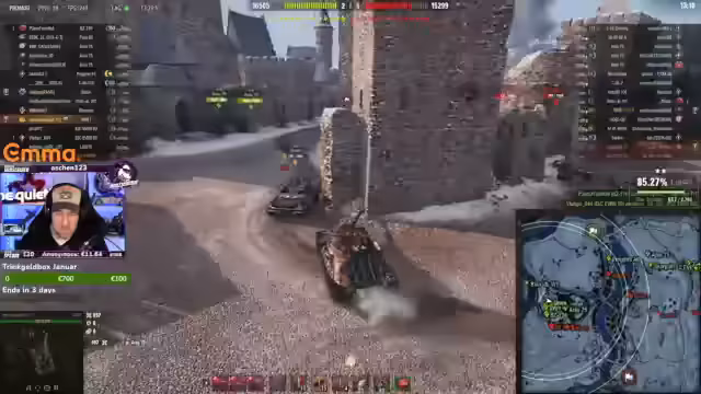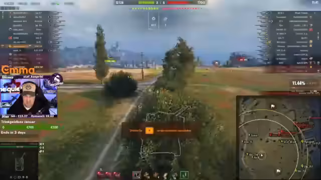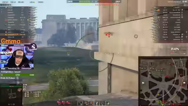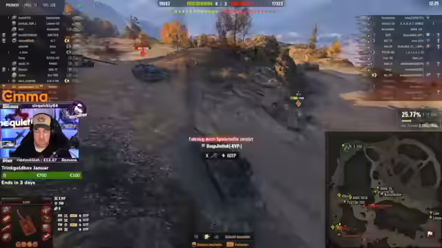 00:12:27Der Streamer analysiert die aktuelle Spielrunde, speziell den Einsatz des G-Saw-Tanks, und bemängelt den fehlenden Premiummunitionseinsatz. Er schildert seine Taktik, den Gegner in die Seite zu flexen, und eine Konfrontation mit einem Scam-Train. Auch ein Spawn im eigenen Team wird kritisiert, der zu Chaos und einem verpassten Vorteil führt.
