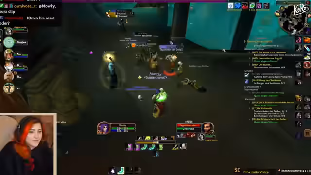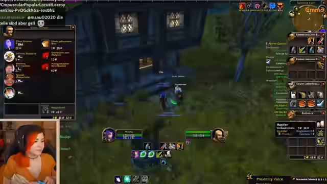 10:03:46Nach dem Leveln plant die Gruppe den Deadmines-Run. Es wird ein temporärer Raid-Leader (Matteo) bestimmt, der Anweisungen gibt. Gleichzeitig werden Gildenaktivitäten besprochen: Ein 'Bluescreen-Death-Clap' (wahrscheinlich ein Streamer-Ereignis) wird erwähnt, und die Gruppe erkundigt sich nach dem Status von Nachtelfen-Chat-Lore und einer bevorstehenden Gildenversammlung. Für den Run werden Buffs (Magiebannung) und Tränke verteilt. Ein Spieler (Mawki) erwähnt, dass er für die Gildenversammlung (als 'Mama' oder 'Millionärin') gewählt werden könnte, was humorvoll aufgenommen wird.