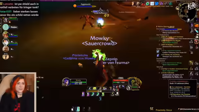 05:25:35Der Streamer ist Teil des Sauerkraut-Events, einem gemeinsamen Gilden-Aktivitäten-Event. Die Strafen, wie das Töten aller Mobs um Hogger, dienen dem Aufbau der Gildenbank mit Crafting-Materialien. Es kommt zu lustigen und chaotischen Situationen, wie das versehentliche Entleeren des Druiden im Spiel oder eine Story über einen Küchenbrand, während der Streamer WoW spielte. Das Gildenleben und die gemeinsamen Erlebnisse, wie das gemeinsame Questen oder das Erzählen von persönlichen Anekdoten, stehen im Vordergrund und schaffen eine starke Gemeinschaft.