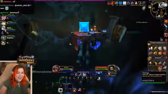 03:30:35Der finaler Bosskampf im Dungeon steht unmittelbar bevor. Der Streamer gibt klare Anweisungen an sein Team, um den Kampf erfolgreich zu gestalten. Alle Spieler sollen ihre Lebenspunkte und Manapunkte auffüllen. Er gibt spezifische Instruktionen für den Hexenmeister bezüglich der genutzten Zauber (keine Feuerattacken) warnt vor bestimmten Boss-Mechaniken wie dem 'Kältedebuff'. Ein Spieler namens 'Jeremy' wird als Running Gag erwähnt.