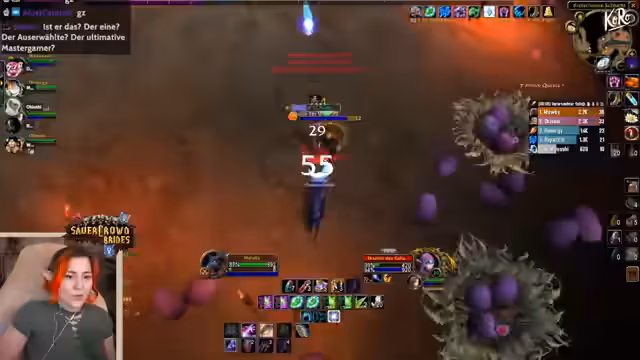 06:13:08Ein spezieller Moor-Boss wird als potenziell gefährlich eingestuft, besonders wenn der Tank nicht ausreichend aggro hat. Es werden Anpassungen der Buffs vorgenommen, wie z.B. das Erhöhen des Ausdauerwerts und das Anwenden von Dornen. Es folgen humorvolle Anekdoten und Interaktionen mit dem Chat, sowie die Diskussion über das Geschlecht von Gegnern und das Casting von Fähigkeiten.