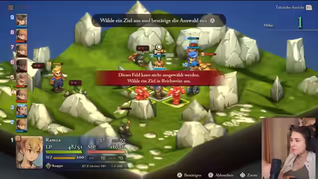 02:47:48Es wird die klassische und erweiterte Version von Final Fantasy Tactics unterschieden, wobei die erweiterte Version eine englische und japanische Sprachausgabe sowie einen zusätzlichen Schwierigkeitsgrad für Anfänger bietet. Das Intro des Spiels wird kommentiert, und es wird überlegt, ob es sich im Vergleich zum Original verändert hat. Die Vertonung wird gelobt. Ein Tutorial-Kampf beginnt, in dem die Steuerung und die Fertigkeiten von Ramsa erklärt werden. Die Zugfolge und die Bedeutung der Zahlen neben den Einheiten werden erläutert. Es wird erklärt, wie man Fertigkeiten auswählt und einsetzt, und die Bedeutung der Angriffreichweite wird hervorgehoben. Es wird gezeigt, wie man die Blickrichtung der Charaktere ändert und wie sich dies auf das Blocken auswirken kann. Es wird erwähnt, dass es schwierig sein kann, sich um alle Einheiten zu kümmern, wenn man später mehr als fünf Leute hat. Es wird sich auf den Kampf konzentriert und die Blickrichtung wird angepasst.