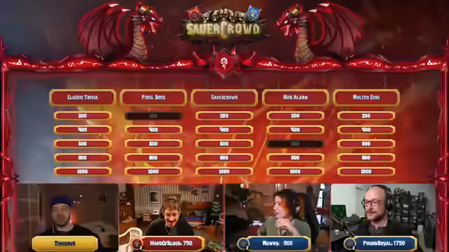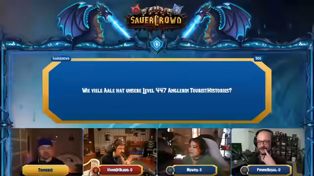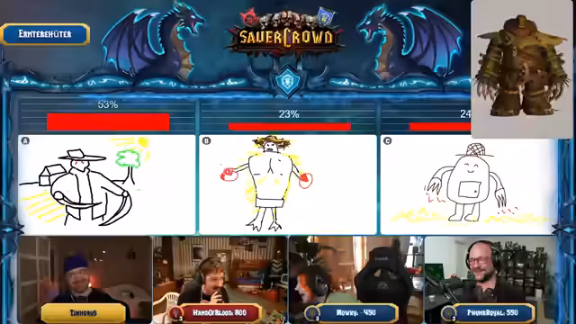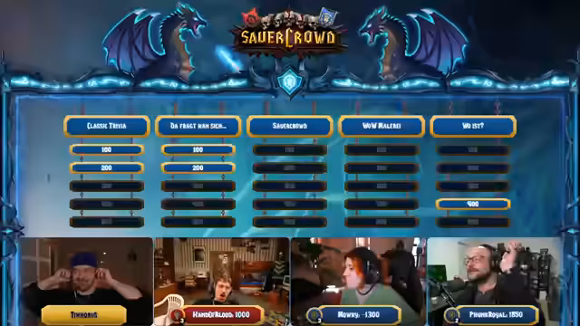 10:29:07Nach einer kurzen Regel-Erklärung beginnt das interaktive Quiz-Spiel im Jeopardy-Format. Es gibt zwei Spielbretter: eines für die Allianz und eines für die Horde. Besonderen Fokus legt der Streamer auf die "WoW Malerei"-Kategorie, bei der die Teilnehmer Begriffe wie den Gildenleiter "Papa Platte" oder einen "Trog" zeichnen müssen. Der Streamer fungiert als Quizmaster, während die Gäste und der Chat über einen Buzzer interagieren. Die Kreativität und Zeichnungen der Teilnehmer werden vom Chat bewertet, was für rege Unterhaltung und viel Gelächter sorgt. Auch klassische WoW-Wissensfragen werden gestellt, bei denen die Teilnehmer um Punkte kämpfen.