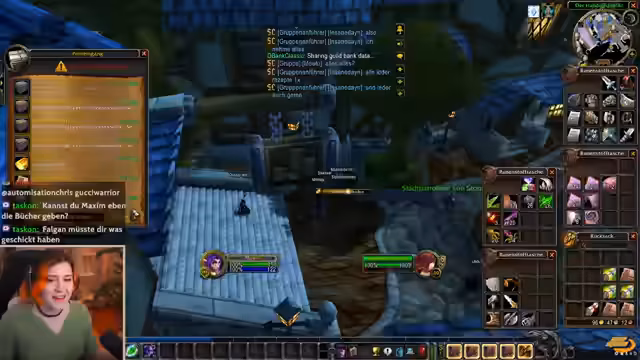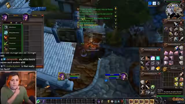 15:42:00Der Fokus verlagert sich auf die aktuelle Gildenaktivität. Es kommt zu organisatorischem Durcheinander, bei dem der Streamer versucht, die Gildenbank zu verwalten, Gegenstände auszutauschen und Mitgliedern wie Mauki Hilfestellung beim Leveln und Farmen zu bieten. Themen sind der Austausch von Kronenboots, die Suche nach Portalen und allgemeine Hektik in der Gildenkommunikation und auf dem Discord.
