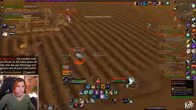 08:34:02Der Streamer und Mauki bewegen sich in ein gefährliches Gebiet, das von der Horde kontrolliert wird und bekannt für PvP-Aktionen ist. Es werden strategische Entscheidungen getroffen, um zu vermeiden, von Patrouillen angegriffen zu werden oder unnötig PvP-Konflikte zu provozieren. Der Streamer erwähnt, dass er in der Vergangenheit kaum PvP-Erfahrung in dieser Region hat, und äußert sich skeptisch über das Verhalten der 'Geysire' in der Gegend. Die Route wird so gewählt, dass sie eine Hordenbasis umgeht, aber es bleibt eine latente Gefahr durch feindliche Spieler und Mobs.
