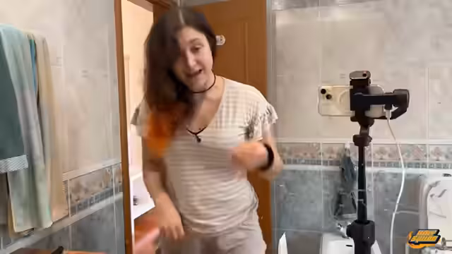 06:08:09Der Streamer zeigt sein persönliches, sehr kleines Bad im Obergeschoss, das ein kleines Fenster, eine Dusche und ein Waschbecken enthält. Es wird als klein aber funktional beschrieben, mit dem Vorschlag, einen Laptop daraufzustellen, um während des Stuhlgangs zu streamen. Die Einrichtung wird als nicht ideal kritisiert, besonders die Positionierung der Papierrolle. Der Streamer hat noch nicht entschieden, wohin er die sanitären Einrichten umstellen soll, und wünscht sich dort einen Schrank.