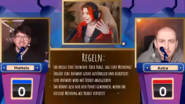 06:25:49Die Show wird als 'Scheit' (später korrigiert) bezeichnet, beworben als intellektuellste Twitch-Show EU-West. Es werden Feuerwerk-Effekte gezeigt und das Spiel 'Entweder oder' angekündigt. Die Regeln: Teilnehmer erhalten Entweder-Oder-Fragen, erklären ihre Meinung ausführlich und diskutieren. Punkte gibt es nur, wenn sie mit der Reddit-Community übereinstimmen. Die Antwort wird mit Reddit abgeglichen, das als Autorität gilt.
