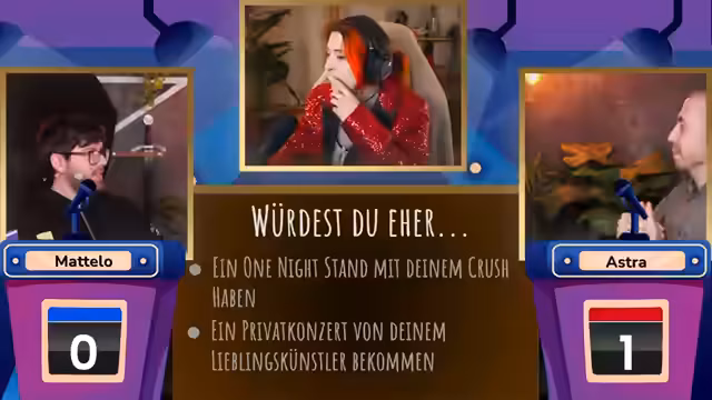 06:36:47Die Frage lautet: Ein Privatkonzert des Lieblingskünstlers oder ein One-Night-Stand mit dem Crush? Asta wählt One-Night-Stand, da er Musik nicht mag und Livemusik ihm nichts gibt. Er erwähnt Performance-Ängste und seine Crush auf Jessica Alba. Matteo stimmt zu und wählt ebenfalls One-Night-Stand. Reddit stimmt knapp zu: 3.600 von 6.600 für One-Night-Stand. Mauki würde aus Prinzip One-Night-Stand wählen, da ein Konzert unnötig ist.