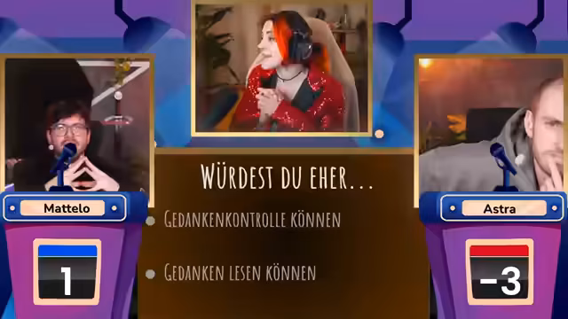06:41:52Die Auswahl zwischen Gedankenkontrolle und Gedankenlesen wird diskutiert. Asta wählt Gedankenkontrolle, da sie beides ermöglicht und mächtiger ist. Er argumentiert, dass man damit Kriege verhindern oder Weltgeschehen lenken könnte, aber auch einen Gotteskomplex entwickeln würde. Matteo stimmt zu. Beide wählen Gedankenkontrolle. Reddit bestätigt mit 4.400 von 6.400 Stimmen. Asta kritisiert fehlende Originalität im Chat.