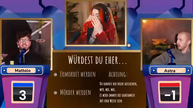 06:57:02Regeln: Die schlimmste Art der Ermordung oder des Mordes wird gewählt, ohne Kontrolle über Opfer oder Methode. Beide entscheiden sich für Mörder werden, da man als Täter überlebt und die Tötung hoffentlich weniger traumatisch ist. Asta und Matteo planen symbolisch gemeinsam. Reddit bestätigt mit 5.017 von 7.000 Stimmen für Mörder werden. Asta erwähnt den Überlebensinstinkt.