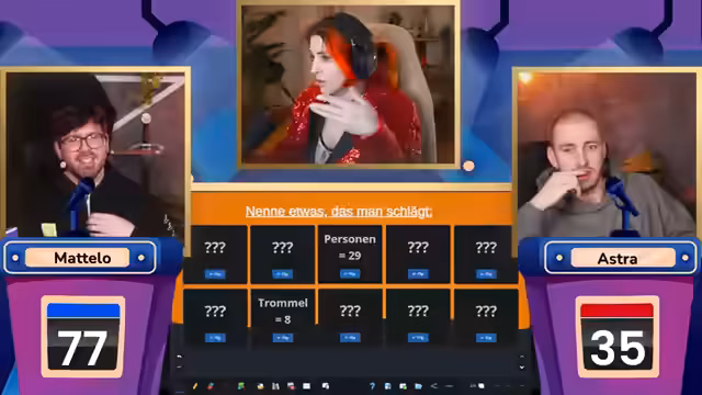 07:21:20Ein neues Spiel namens Fragi wird eingeführt, bei dem die Teilnehmer Antworten aus Umfragen erraten müssen. Die Regeln besagen, dass jeder drei Versuche pro Frage hat und Punkte basierend auf der Popularität der Antwort erhält. Es folgt eine Frage nach Dingen, die man nicht zu Hause haben möchte, mit Antworten wie Schimmelpilz und Schwiegereltern. Die Runde wird mit humorvollen Kommentaren und Punkteupdates für Matteo und Asta fortgesetzt, während die Zeit für schnelle Antworten drängt.